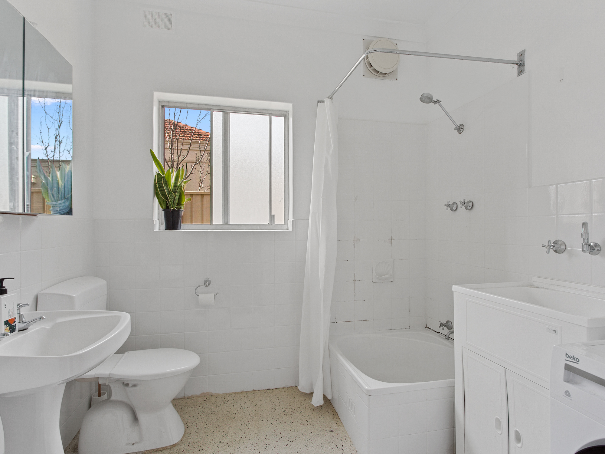 • Large bathroom with bathtub and toilet, adjacent to laundry